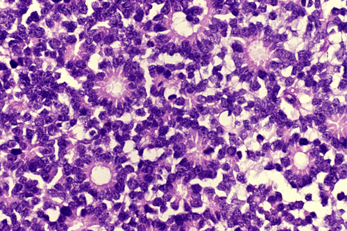 Most often, tumor cells arrange in Flexner-Wintersteiner rosettes typified by tall cuboidal cells formaing a small, circumstribed lumen with well defined limiting membrane on the luminal side. The tumor nuclei are found at the basal end of the cuboidal cells while the apical end contains the cytoplasm. Small projections are protruding from the luminal surface into the lumen and these projections represent residual features of photoreceptor cells. Homer-Wright rosettes can also be found but are less common. In between the rosettes are solid sheets of poorly differentiated tumor cells.