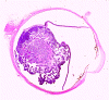 Medulloepitheliomas, also know as “diktyomas” in the past, are rare retinal tumors that display morphologic and phenotypic features recapitulating the sixth week stage of development of the optic vesicles. In contrast to medulloepitheliomas arising in the brain that carry a grave prognosis, there were only 4 fatal cases out of 61 cases that have been reported in two separate series 29, 30. These rare tumors occur in later childhood with a mean age of 5 years at the time of definitive diagnosis 29, 30. Histologically, there is a benign form and a malignant form. These tumors usually arise from the ciliary epithelium as a well circumscribed mass or it may be infiltrating the surrounding tissue. Rarely, they are found in the iris or optic disc. On low-magnification, these tumor may have a lacy or net-like architecture.Most often, they have an organoid pattern of growth and the epithelioid cells have a limiting membrane in the inner, free surface. Mitotic figures are common. These epithelial cells are supported by a stroma. The teratoid variant (teratoid medulloepithelioma) contains heterogenous components such as cartilaginous, osseous, and rhabdomyoblastic components. The malignant form contains undifferentiated round cell component. Solid areas of these tumors resemble retinoblastomas. The other criterion for a diagnosis of malignancy is overt sarcomatous changes in the heterologous components.