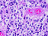 Metastatic clear cell carcinoma should be considered. Some of these tumors, particularly metastatic renal cell carcinoma, can have rather bland nuclear morphology. Metastatic carcinoma are positive for epithelial markers such as cytokeratin and epithelial membrane antigen.