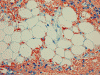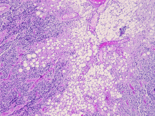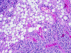 Cerebellar liponeurocytoma have been described in the cerebellar vermis, hemispheres and as tumor that grow into the cerebellar pontine angle. Histologically, the neuronal/neurocytic component is composed of sheets of uniform polygonal cells with round nuclei. Distinct perinuclear halo similar to those being seen in oligodendroglioma and central neurocytomas are present in the neuronal/neurocytic component. This would lead to a honey comb pattern under low- or medium-magnification. Some of these cells may also have amphophilic granular cytoplasm. Neuropil formation can be focally seen. The lipidized component is morphologically indistinguishable from mature, adult type of adipose tissue in other part of the body. Histologic variation between different tumors do not appear to be substantial.