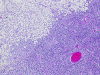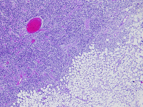 Clinical information: The patient was a 48 year-old man who presented with unstable gait, frequently tripping, and occipital headache. There was no hearing loss or visual disturbance. There was no history of excessive alcohol use, drug abuse, brain surgery or trauma. He worked as an office manger in a department store and had no history of exposure to chemicals. There was no sensory or motor deficits. An MRI examination disclosed a well demarcated, midline cerebellar mass that was 3.0 in greatest dimension. The mass obstructed the fourth ventricle and extended to the vermis. There was no cyst formation. The mass was isointense on T1-weighted images. Multiple small hyperintense foci consistent with "fat density" were present. There was also mild enhancement. The mass was isointense to focally hyperintense on T2-weighed images. Mild hydrocephalus was also present in the lateral and third ventricle. An open resection was performed. Representative histologic photomicrographs are illustrated here.