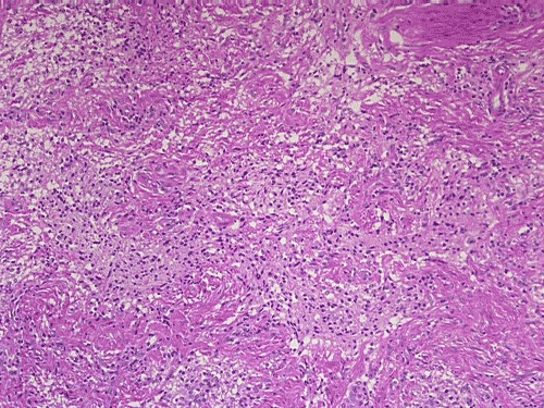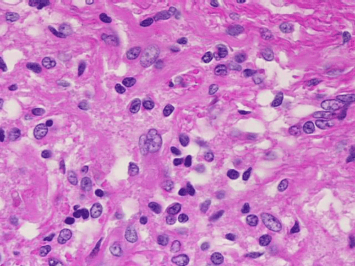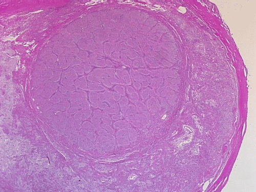 Microscopically, ONG in children are almost all pilocytic astrocytomas. The optic nerve is expanded. The fibrovascular septa within the optic nerve are separated by the tumor cells but the structure can still be well recognized as an optic nerve on cross section. Three major patterns are recognized 1. In the first pattern, the tumor is finely reticulated. In the second pattern, the tumor has microscysts and is coarsely reticulated. In the third pattern, the tumor cells are coarsely fibrillated, spindle shaped, and form bundles. There is minimal pleomorphism in the nuclei and it is not always easy to separate the neoplastic cells from adjacent reactive gliosis. There is a usually lack in mitotic activity, endothelial proliferation, and necrosis. Immunohistochemistry, the tumor cells are strongly reactive for glial fibrillary acidic protein (GFAP).