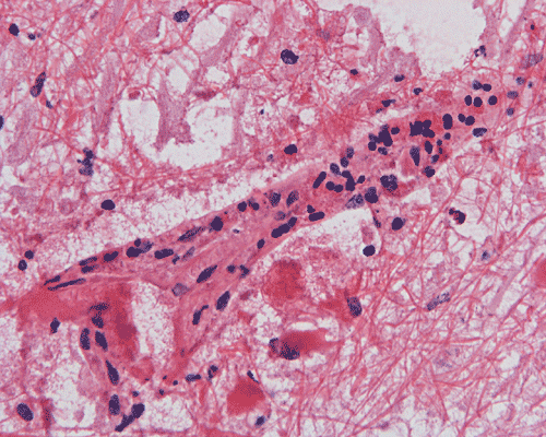 The eosinophils play an important role in causing the damages. Infiltration by eosinophils and depositions of activated products of eosinophils are commonly seen in atopic disorders, such as atopic bronchial asthma, allergic rhinitis and atopic dermatitis. The presence of atopic diathesis as well as eosinophilic cationic protein deposition suggests that atopy may represent one of the risk factors for developing eosinophilic myelitis. Eosinophilic cationic protein is one of the neurotoxic proteins released by activated eosinophils Eosinophil cationic protein and other products of eosinophils such as major basic protein have been shown to be neurotoxic. The infiltrating eosinophils may therefore well contribute to the neural damage.