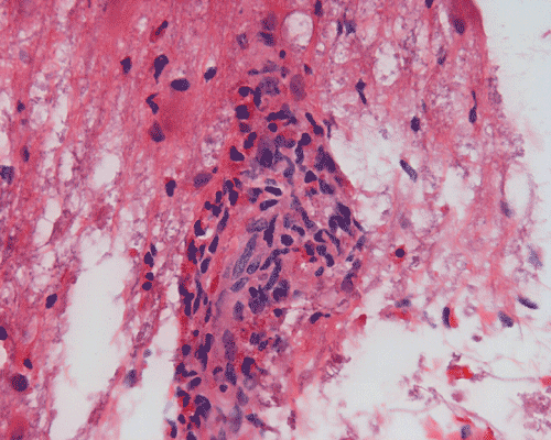 Lymphoma and leukemia: Isolated primary lymphoma of the spinal cord is very rare. Most primary lymphoma of the central nervous system are diffuse large-B cell lymphoma with significant nuclear pleomorphism. Recognition of this entity not difficult. The morphology of lympomatous and leukemic infiltration is dependent on the histologic type of the primary tumor. A knowledge of pre-existing lymphoma or leukemia and its histologic type is important. Flow cytometry is a very helpful tool in distinguishing non-clonal lymphocytic infiltration from lymphomatous and leukemic infiltration with low grade histology. This decision, however, must be made during intraoperative consultation. A high index of suspicion, careful clinical and radiological correlation, careful morphological and immunohistochemical study of permanent sections would usually allow recognition of lymphomatous or leukemic infiltration.