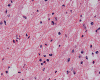 Panel A to E are MR images. Panel F and G are taken from intraoperative cytologic preparation. Panel H to M are taken from frozen section. Panel N and O are from paraffin section. These sections are stained by hematoxylin-eosin stain. Panel P is immunohistochemistry for neurofilament proteins. Panel Q is stained by Luxol fast blue-Periodic acid Schiff (LFB-PAS) stain.