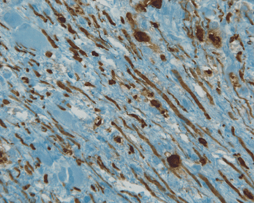 Langerhans’ cell histiocytosis: Langerhans’ cell histiocytosis is featured by infiltration by Langerhans’ cells, lymphocytes, and eosinophils. Isolated Langerhans cell histiocytosis involving the spinal cord is exceedingly rare. In addition, Langerhans’ cells contain deep nuclear groove which give a “coffee bean” appearance and they are positive for S100 protein and CD1a by immunohistochemistry. [Click here to see Langerhans cells]