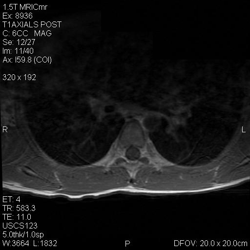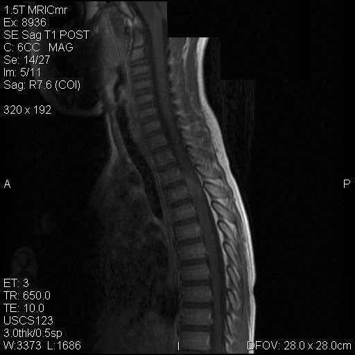 ATM refers to an acute inflammation of the spinal cord that is restricted to a few segments but extends horizontally across most of the spinal cord of the involved segment. Both sensory and motor functions are affected and the thoracic cord is most commonly involved.. The term "transverse" is not very precise from the clinical point of view as the spinal manifestations are often asymmetrical. In many circumstances, it is a manifestation of multiple sclerosis. However, ATM can occur in many different situations including autoimmune diseases such as systemic lupus erythematosis, autoimmune vasculitis, Lyme disease, syphilis, radiation and schistosomiasis. ATM can also be resulted from direct viral infection and post-infectionous reaction. Myelitis, sometimes in the form of transverse myelitis, and encephalomyelitis remain well documented but rare complications to a variety of vaccinations 1, 2, 3, 4. Clinically, there is rapidly progressive (in terms of hours or days) paraparesis, sphicteric dysfunction, and bilateral Babinski sign. The acute onset is marked by flaccid paralysis of the lower extremities with acute urinary retention. The sensory level is usually a good guide of the level being involved.