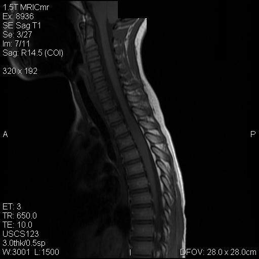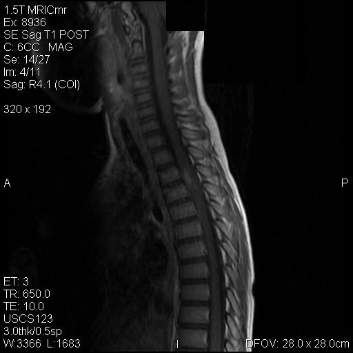 Clinical information: The patient was a 9 year-old African-American boy. He developed left lower extremity progressive weakness 4 months ago (in May). As per his father, the patient started "dragging" his left leg in May. He was first evaluated by the orthropedic service and was later referred to the neurosurgery service of this institution. The patient had asthma and his treatment had been intermittent. There was no history of seizures or other neurologic disease. The family history was unremarkable. He was born in the United States never traveled beyond the state border of Oklahoma.