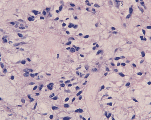 Pilocytic astrocytoma is an indolent tumor of WHO grade I. The vast majority of them are seen in children. The most common location is the cerebellum but they can be found throughout the brain and spinal cord. Pilocytic astrocytomas arising in optic nerve, optic chiasma/hypothalamus regions are often associated with neurofibromatosis 1. Radiographically, cerebellar pilocytic astrocytomas are typically cystic, with a mural nodule, and enhancing. The salient histologic features are elongated, bipolar cells with long, cytoplasmic process. The tumor cells tend to arrange in a densely-packed, loosely packed pattern. However, other patterns including a clear cell pattern that mimics oligodendroglioma may be present. Rosenthal fibers and eosinophilic granular bodies are often but not always found. Mitotic figures are absent or, at most, uncommon. No substantial nuclear pleomorphism is present. Glomeruloids of thin walled blood vessels are also a common finding. In contrast to PMAs, areas with microcystic changes and myxoid changes are only focal. In the study by Tihan et al., the 13 hypothalamic tumors with classic features of pilocytic astrocytomas shows much better prognosis, no dissemination through the CSF and no patient died of disease 1 . [Click here to see a case of pilocytic astrocytoma]