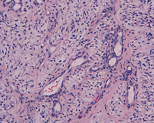 In a substantial amount of area, the tumor is composed of spindle cells with prominent perivascular arrangment and microcyst formation (Panel A and B). These vessels are surrounded by a thin rim of bipolar spindle cells (Panel C). The paucicellular perivascular mantle that is typical for ependymoma is absent in these perivascular arrangements. Adjacent to these perivascular arrangment is substantial amount of myxoid changes. On high-magnification, the tumor cells appear bland in histology, bioplar and spindle in shape, and admixed with a large amount of myxoid substance (Panel D and E). There is a lack of mitosis or significant pleomorphism. In some areas, the tumor is composed exclusively of spindle cells in a myxoid background with microcyst formation but without perivascular coronary arrangement of tumor cells (Panel F). It is not uncommon to observe areas with spindle cells clinging to the blood vessels (Panel G). In a minority of areas, there is increase in cellularity (Panel H). Some vessels seem to be composed of glomeruloids of blood vessels with plump endothelial cells (Panel I).
