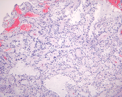 Ultrastructurally, the spindle shaped cells contain a large amount of intermediate filaments 8. Fuller et al. described microvilli, cytoplasmic blebs and rare cilia in the bipolar spindle cells and these observations raises the possibility of an ependymal phenotype of PMAs. Cytoplasmic vesicles, coated pits, and occasional synaptoid complexes have also been described 10.