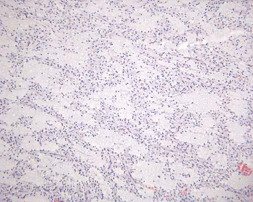 Clinical information: The patient was an 18 month-old girl who had a contrast enhancing hypothalamic mass. The mass was surgically removed. The following photos are taken from representative areas.