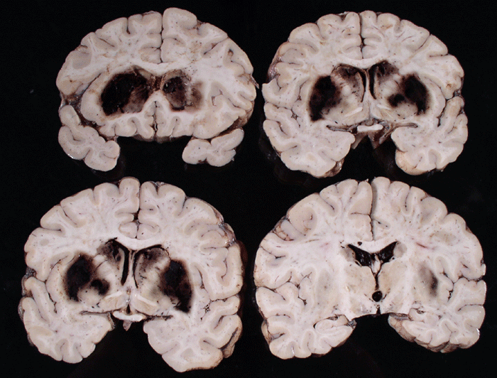 On coronal sections, bilateral putamen and globus pallidus are hemorrhagic and contain large blood clots. Both caudate nuclei are also soft and hemorrhagic with small amount of blood rupturing into the lateral venticles with extension to the third and fourth ventricles. Despite the ventricular blood, there is no ventricular enlargement. In fact, the lateral ventricles appear compressed because of the cerebral edema. The fourth ventricle is slightly dilated by the intraventricular hemorrhage. Overall, there is a striking symmetry between the hemorrhage on the left side and the right side. Also, the hemorrhages in the caudate nuclei appear to be separate foci rather then extension of the hemorrhage from the putamen. Despite the close proximity of the internal capsules and thalamus to the hemorrhagic basal ganglia, they appear uninvolved. The cerebral cortex, cerebral penducle, the corpus callosum, and centrum ovale are within normal limits. The cerebellum and brain stem are also grossly unremarkable. The symetrical distribution and hemorrhage limited to the caudate, putamen and globus pallidus is quite unusual in this case.