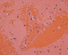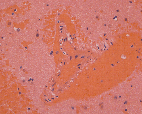 Microscopic neuropathologic findings: Microscopically, the basal ganglia has hemorrhage that are rimmed by a thin layer of necrotic tissue. There are no reactive changes, acute or chronic inflammatory cell infiltration, vasculitis, new vessel formation, or hemosiderin deposition. A reticulin stain is performed and found no evidence of vascular malformation. Pathologic changes in samples that are obtained from different hemorrhagic areas from both cerebral hemispheres appear to be similar and are consistent with the early stage of acute hemorrhage. No necrosis, neuronal death or hemorrhage are identified in the brainstem.