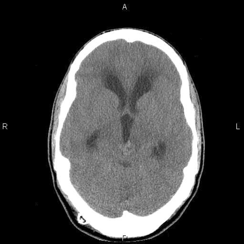 A poorly defined lesion is identified in the pineal region of the CT scan. The increased density suggest calcifications (Panel A). A moderate degree of hydrocephalus is also present (Panel B).