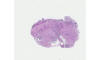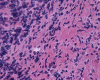 Intraoperative consultation: The specimen is that of a streotactic biopsy and is very small. The intraoperative cytologic preparation was rather hypocellular. Small clusters of cells with bland nuclei and foamy cytoplasm are present and they are highly suggestive of foamy histiocytes (Panel C). On frozen section, there are many small lymphocytes in a "pink" background that can be a granulomatous process (Panel D). In some areas, many foamy macrophages are present and one particular fragment appear to be a possible portion of a wall of structure with lining cells suggestive of macrophages (Panel E).