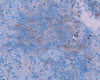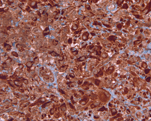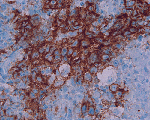 Immunohistochemically, the neoplastic cells show cytoplasmic membranous patten, sometimes diffuse cytoplasmic pattern, of staining for placental alkaline phosphatase (PLAP). Detection of c-kit (CD 117) in germinoma has been demonstrated and serves as a good diagnostic aid. Activating KIT mutations may contribute to tumorigenesis in germinoma 6, 7, 8. Syncytiotrophoblastic cells can be positive for human chorionic gonadotrophin (hCG). Occasional positive immunoreactivity for cytokeratin has been described and should not be taken as the sole evidence for embryonal carcinoma.