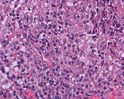Intracranial germinoma is histologically identical to ovarian dysgerminoma and testicular seminoma. There is a tendency to infiltrate adjacent structures and to spread throughout the ependyma, the ventricular system and subarachnoid spaces. Microscopically, they consist of nests, lobules, cords, and/or sheets of large round tumor cells with well-defined borders, clear to pale cytoplasm with artifactual vacuolization, round and centrally located nuclei with open chromatin and prominent round or bar-shaped nucleoli. The cytoplasm is glycogen-rich, making these cells periodic acid-Schiff (PAS)–positive and diastase sensitive. These tumor cells are mitotically active. Atypical mitosis, however, is not a common finding. Necrosis is usually not prominent. In the most classic histologic picture, clusters and cords of large germinoma cells are separated by a dense, lymphocytic infiltration admixed with some macrophages and a delicate fibrovascular network. Plasma cells may be found. At medium-power magnification with hematoxylin and eosin stain, the contrast between the smaller, darkly staining lymphocytes and the larger, pale staining cytoplasm of neoplastic cells is virtually pathognomonic. The amount of inflammatory cells can have wide variations among different tumors. In some occasions, the large germinoma cells are difficult to be found and the overall picture may suggest a lymphoma. Syncytiotrophoblastic cells can also be present. These cells should not be mistaken as evidence of choriocarcarcinoma.