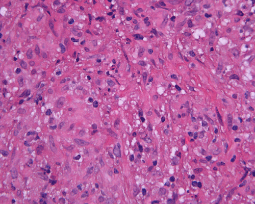 Germinomas can elicit an atypical gliosis in the surrounding glial tissue which may be confused with malignant glial neoplasms. This is true particularly of specimens taken from the periphery of the germinoma. The tumor may appear as a desmoplastic tumor. The inflammatory response may be problematic in reaching a histologic diagnosis, especially in small biopsies, as macrophages can be difficult to distinguish from a non-seminomatous neoplastic component.