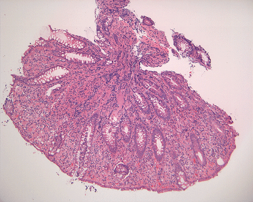 Although autopsy findings have identified the presence of Histoplasma capsulatum in the gastrointestinal tract of 70-90% of patients with progressive disseminated histoplasmosis 10, 14, 15, H. capsulatum is uncommonly recognized as the causative agent in gastrointestinal disease. This organism is considered to be the etiologic agent in only 3-12% 16,17 of patients with gastrointestinal clinical symptoms perhaps due to the non-specific clinical presentation of gastrointestinal histoplasmosis. The most common symptoms include abdominal pain, fever, diarrhea and weight loss. Intestinal obstruction, gastrointestinal bleeding and perforation are less frequently reported 16. Common clinical manifestations include ulcers, hemorrhage, nodules and masses 18 which can mimic inflammatory bowel disease or malignant process making the diagnosis challenging 19. Gastrointestinal involvement in disseminated histoplasmosis can involve any segment of the gastrointestinal tract containing lymphoid tissue. Terminal ileum, therefore, is the most frequent site of involvement in the GI tract due to the abundant amount of lymphoid tissue 20.