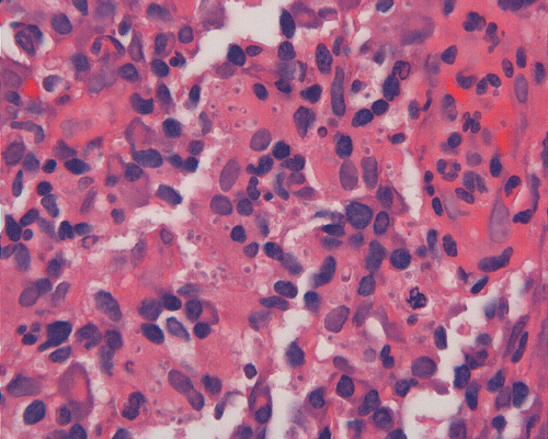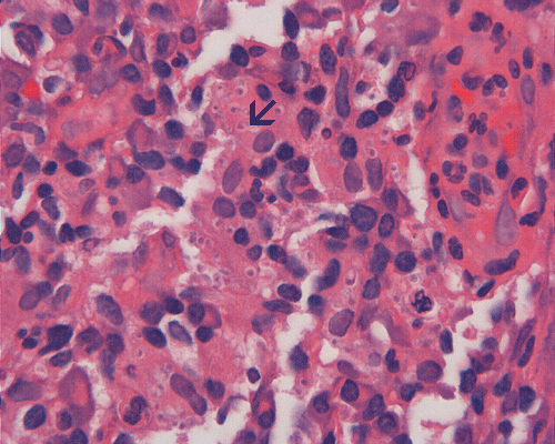 In immunocomprised patients that have defective cellular immunity, granuloma formation may be rather indistinct as illustrated in our case. The yeast form of Histoplasma capsulatum is found in tissue and they are usually under 5 mm in diameter and appear as ovoid yeasts. The lung is the most affected organ. Granuloma formation, typically multiple, with extensive caseous necrosis and a variable amount of calcifications are the typical pathologic changes in the lung. These granulomas are often demarcted from the surrounding tissue by a fibrous wall. Granulomas in the lung can get quite calcified with time. The pulmonary nodules can also enlarge slowly to give a wrongful clinical impression of neoplasm, the so-called histoplasmoma. The living yeast in tissue, often occur in clusters, has a basophilic center and a translucent halo that represents the capsule. They are often engulfed by histiocytes as illustrated in this case. Dead organisms appear eosinophilic and cannot be detected easily in granuloma by hematoxylinj-eosin stain. The microorganism is numerous and can be identified on routine hematoxylin-eosin stain with astute observation and high index of suspicion. Typically, there are numerous yeasts and they are present even in heavily calcified nodules or granulomas.