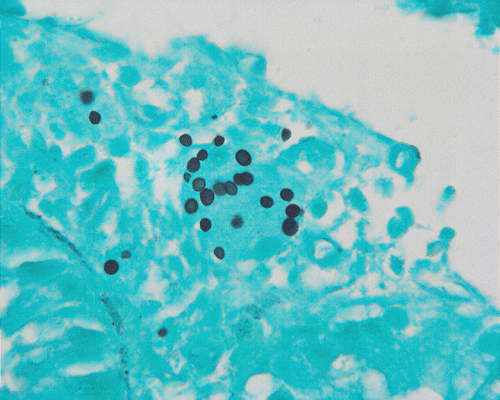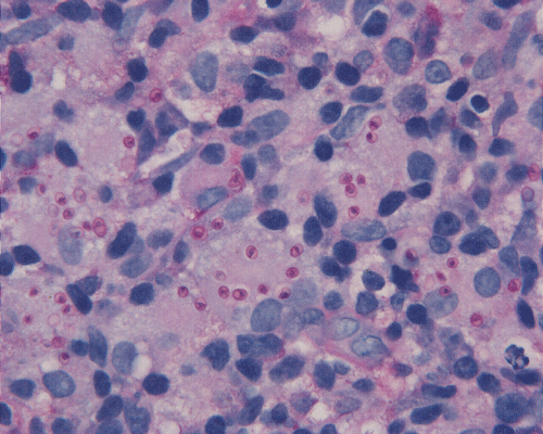 H. capsulatum, like many other fungal organisms, are well demonstrated by periodic acid Schiff (PAS) stain, Gomori’s methamine silver (GMS) stain, and other appropriate stains in tissue. Although the size and shape can suggest Candida species, there is no pseudohyphae formation in H. capsulatum which allows the distinction. They also lack the paired dense capsular thickening as in Pneuocystis carinii. Coccidiodes immitis form large endospores which allow separation from H. capsulatum. [Click here to see a picture of C. immitis with GMS stain]