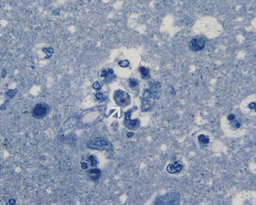 Microscopically, it is essentially an acute, necrotizing meningoencephalitis with or without hemorrhage. There is intense perivascular inflammatory cell infiltration in the leptomeninges and in the parenchymal blood vessels and the inflammatory cells is typically a mixture of lymphocytes, mononuclear cells and substantial amount of neutrophils. Degenerated polymorphonuclear leukocytes are common. Necrosis associated with the inflammatory infiltration is common. N. fowleri are found predominantly in the Vichow-Robin space as round cells about 10-20 mm in diameter. They have pale vesicular nuclei and prominent nucleoli with chromatin lining the nuclear membrane. The cytoplasm is amphophilic and may appear vesicular or bubbly. Periodic acid Schiff stain does not offer any advantages in identification of these cells. Masson’s trichrome may be helpful. When N. fowleri are found in the parenchyma, they may appear polymorphic and not round. Astute recognition of the nuclear feature is the key to find these cells in the parenchyma. In contrast to Acanthoamoeba species, N. fowleri does not have cyst formation. This feature allows differentiation.