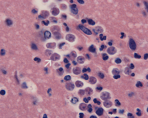 Clinical information: In August, a previously healthy 11 year-old boy was presented to a clinic with the initial complain of headache. A few hours later, he started to have nausea and vomiting. The vomiting became bilious later. There was no associated diarrhea, cough, or rash. The patient became progressively listless and lethargic. He was treated by his physician but his condition continue to deteriorate. One day later, he was hallucinating, confused, and had brief episodes of stiffening. The child was admitted to the emergency room on the same day. Blood cultures for bacteria and enterovirus were negative. On admission, he was obtunded and had some photophobia but he was spontaneous opening of eyes and some purposeful movement. The peripheral white blood cell count was 24,600 cells/mm3 with 79% neutrophils. For the cerebrospinal fluid (CSF), the glucose level was 58 mg/dl, protein was 256 mg/dL, and there were 2079 white blood cells per mm3 and there were 79% neutrophils. A test for Cryptococcus neoforman antigen was negative in the CSF. A diagnosis of meningitis was made and the child was treated with vancomycin and ceftriaxone. His condidtion did not improve. A CT scan revealed evidence of increased intracranial pressure and tonsillar herniation. An MRI scan revealed diffuse cerebral edema. The lateral and fourth ventricles were totally effaced and there was uncal and tonsillar herniation. There was also focal patchy changes in the left cerebellum and globus pallidus that are suggestive of infarction. There was also diffuse enhancement of the leptomeninges, bilateral frontal lobes and bilateral temporal lobes. He also had high fever with a temperature of 40.3 ˚C.