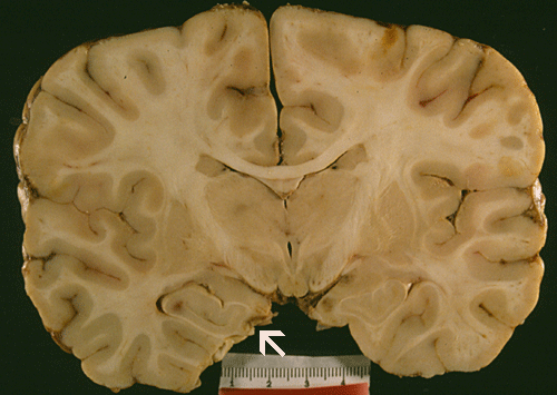 Gross pathology: The brain weighs 1,650 grams (normal is 1,320 grams and was grossly edematous. The leptomeningeal surface appears slightly granular and this feature is best appreciated on side lighting (Arrow in Panel A). On coronal sections, the lateral ventricles are totally collapsed and the sulci are flattened out by the edema. There are some poorly defined brownish, round patches in the cortex and thalamus. The uncal notch on the left side (Panel B) appears deep, brownish and friable whie the uncal notch in the right side appear deep. There are focal necrosis in the orbital frontal lobe, bilateral olfactory bulbs, and bilateral temporal lobes.