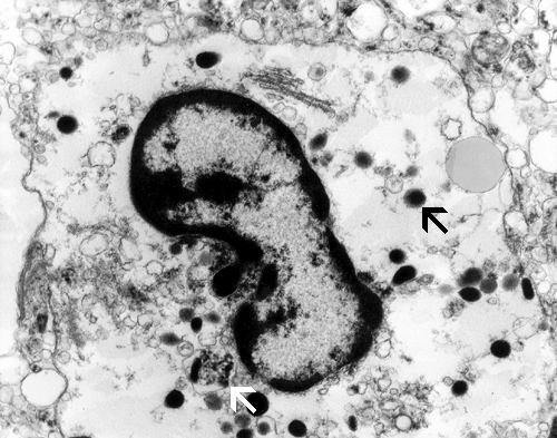 Under the electron microscope, the microorganisms in the Vichow-Robin space appear as round cells with many phagocytic or lysosomal vacuoles. A large nuclei with chromatin lined nuclear membrane and large, prominent nucleoli is also helpful in identification.