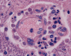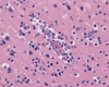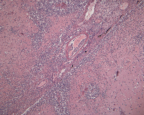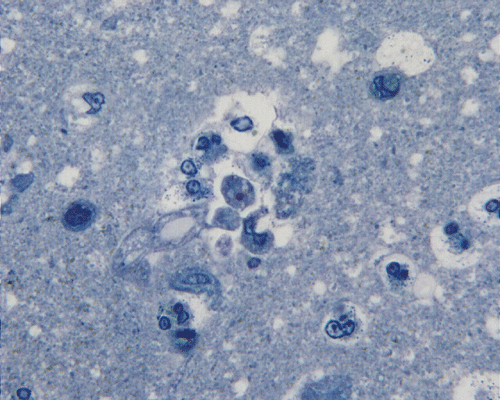 Clinical information: In August, a previously healthy 11 year-old boy was presented to a clinic with the initial complain of headache. A few hours later, he started to have nausea and vomiting. The vomiting became bilious later. There was no associated diarrhea, cough, or rash. The patient became progressively listless and lethargic. He was treated by his physician but his condition continue to deteriorate. One day later, he was hallucinating, confused, and had brief episodes of stiffening. The child was admitted to the emergency room on the same day. Blood cultures for bacteria and enterovirus were negative. On admission, he was obtunded and had some photophobia but he was spontaneous opening of eyes and some purposeful movement. The peripheral white blood cell count was 24,600 cells/mm3 with 79% neutrophils. For the cerebrospinal fluid (CSF), the glucose level was 58 mg/dl, protein was 256 mg/dL, and there were 2079 white blood cells per mm3 and there were 79% neutrophils. A test for Cryptococcus neoforman antigen was negative in the CSF. A diagnosis of meningitis was made and the child was treated with vancomycin and ceftriaxone. His condidtion did not improve. A CT scan revealed evidence of increased intracranial pressure and tonsillar herniation. An MRI scan revealed diffuse cerebral edema. The lateral and fourth ventricles were totally effaced and there was uncal and tonsillar herniation. There was also focal patchy changes in the left cerebellum and globus pallidus that are suggestive of infarction. There was also diffuse enhancement of the leptomeninges, bilateral frontal lobes and bilateral temporal lobes. He also had high fever with a temperature of 40.3 ˚C.
