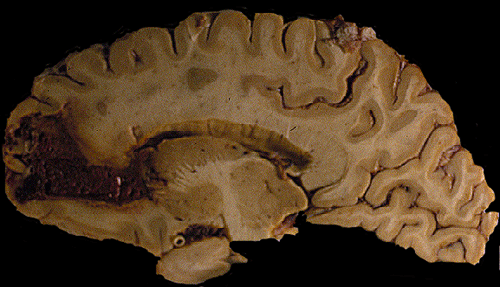 Clinical information: The patient was a 70 year-old man with a history of alcoholism, stenosis of the carotid arteries, hypertension, seizure, unstable gait and questionable dementia. He sustained a minor fall about two to three weeks ago and started to have confusion and neurologic deterioration. He died of sepsis about three weeks after the fall. Autopsy was restricted to the brain. Representative images are shown below: