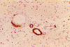 Microscopically, the pathology of hemorrhage is not different from that of hemorrhage due to other causes. However, the blood vessels, particular the arterioles and the leptomeningeal vessels appear to have thickened wall and some clumpy irregular, eosinophilic depositions may be seen. The depositions are also positive for periodic acid Schiff stain. The affected vessels in Ab caused CAA often have segmental dilatations, microaneurysm formation, and fibrinoid necrosis. The small muscle layer is often destroyed. In severely affected vessels, a double-barrel vessel wall is present.The amyloid depositions will stain bright orange-red with Congo red and will give a green birefrigence under polarized light. In addition, immunohistochemical detection would be positive for Ab in many of the sporadic cases. P-component which almost always co-deposit with amyloid can also be detected by immunohistochemistry. At the ultrastructural level, Ab amyloid appears as clumps and bundles of straight filaments of 10 nm in diameter.