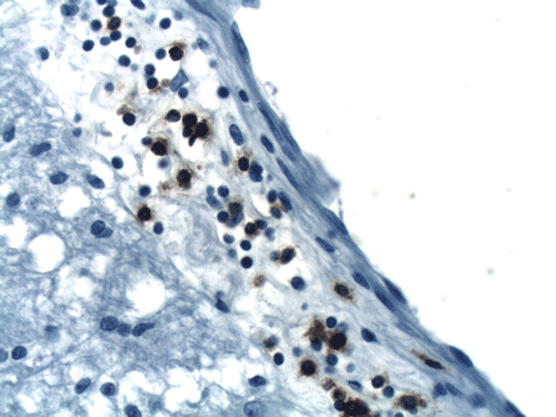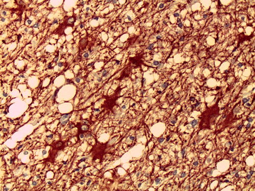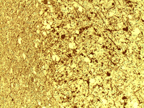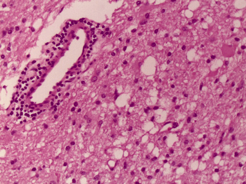 A left frontal lobe biopsy was performed and yield the following representative photomicrographs.