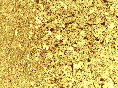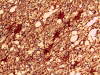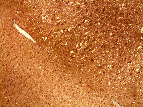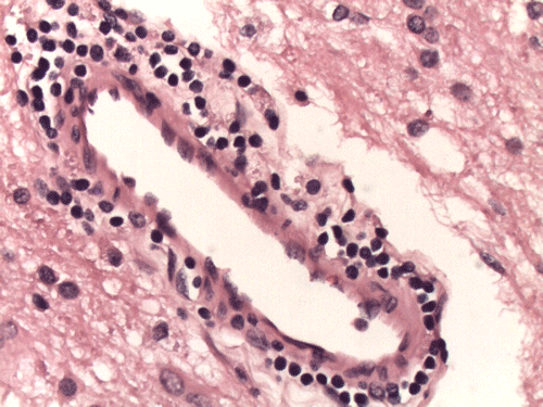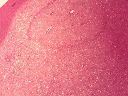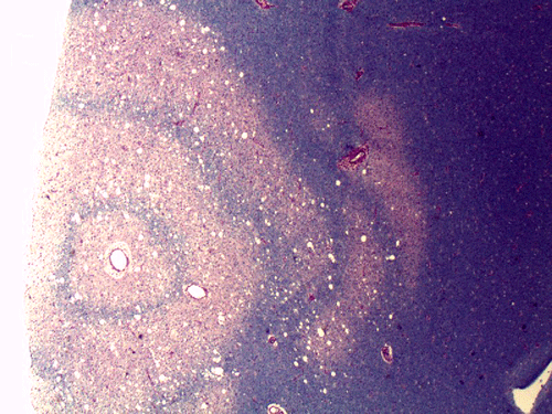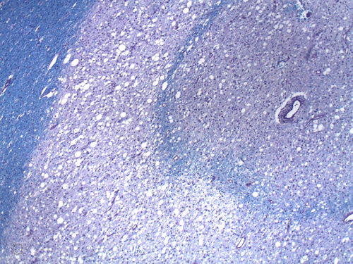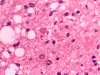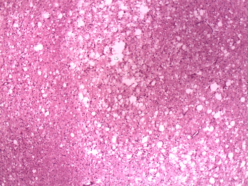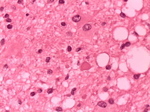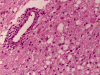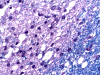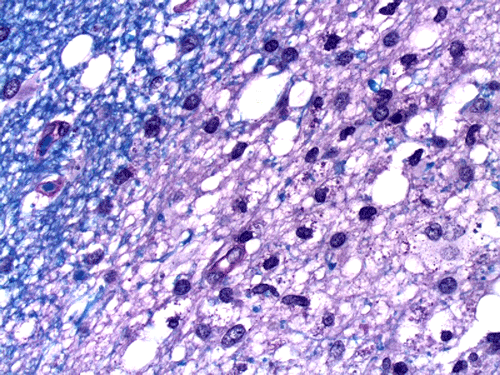 On histology, there are extensive spongiform degeneration and vacuolar degeneration of the deep white matter associated with variable macrophage, profound axonal loss, degenerating axons with spheroid formation and evidence of axonal injury in adjacent normal appearing white matter 1, 2, 3, 4. Demyelinating changes featured by lost of myelin and infiltration of macrophages have also been described 1, 2, 5, 6. Under the electronic microscope, there are vacuolar degeneration of the oligodendroglia, swollen mitochondria and distended endoplasmic reticulum.