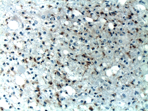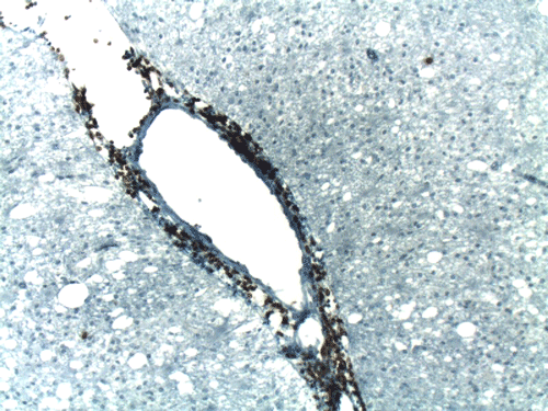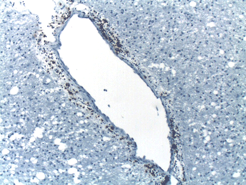 On CT scan, there is multiple hypodense white matter lesions that appear to spare a thin layer of subventricular white matter (Panel A). The T2-weighted images on MRI provides a more accurate estimation. The white matter in the occipital lobes is most affected (Panel A). There is extensive vacuolar changes in the white matter (Panel B and C) and there is a questionable increase in cellularity. In some of the thin walled blood vessels, there is a thin layer of perivascular lymphocytic infiltration which is free of atypia (Panel D, E, and F). The lymphocytes do not appear to extends into the parenchyma. On higher magnification, some large reactive astrocytes can be seen (Panel G). In a minority of areas, some concentric rings can be seen on hematoxylin-eosin stained sections (Panel H). These rings appear to be alternating rings of myelinated and demyelinated white matter and the vacuolar changes appear to be limited mainly to the concentric lesions. The adjacent myelinated areas are spared (Panel I). In some areas, the level of myelin loss appears to be proportional to the level of vacuolar changes (Panel J and K). On immunohistochemistry for glial fibrillary acidic protein (GFAP), the degree of gliosis is also more impressive in areas with more prominent vacuolar changes (Panel L and M). The vacuolar areas also appear to have a reduced density of axons (Panel N). Axonal spheroids are also present in these areas (Panel O). Although a prominent infiltration of foamy histiocytes is not noted on hematoxylin-eosin stains, immunohistochemistry for CD68 illustrated positive cells in a minority of demyelinated areas (Panel P). These cells lacks the foamy nature of macrophages and their morphology would suggest microglial cells. The reactive astrocytes are not immunoreactive for CD68 (Panel Q). Immunohistochemistry for T-cells (CD3) and B-cells (CD20) demonstrates only a thin rim of perivascular infiltration without significant extension into the surrounding parenchyma (Panel R, S, and T).