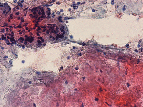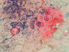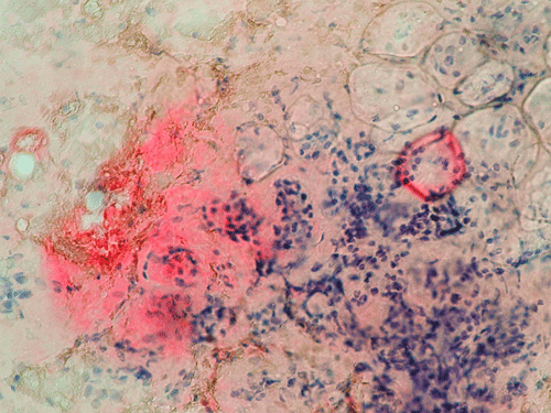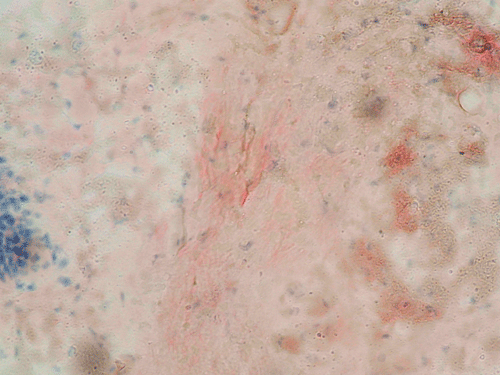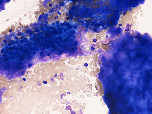 Primary amyloidosis tends to involve the heart, gastrointestinal tract, nerves, skin, tongue, eye, and respiratory system. Secondary amyloidosis tends to involve the kidneys, liver, spleen, lymph nodes, adrenals, and thyroid. Symptomatic amyloidosis of the head and neck is a rare but well documented condition 3, 4, 5, 6, 7. Most cases in this region involve one organ, without evidence of generalized involvement. The cytologic diagnosis of unexpected amyloidosis in the head and neck region can be challenging. Amyloid can be misinterpreted as keratin debris, colloid, chondroid or basement membrane material. Salivary gland amyloidosis is most often secondary and can mimic Sjogren’s syndrome and also pleomorphic adenoma because of the amorphous appearance of amyloid. Amyloidosis involving the major salivary gland in the form of a mass is rather uncommon and often present as diffuse or focal, bilateral enlargement of salivary glands. Variable amounts of acellular, eosinophilic extracellular material stains pale red with Congo red stain, and exhibits a characteristic apple-green birefringence under polarized light. The remainder of the smear is often hypocellular, with scant or absent acinar cells, and scattered clusters of ductal epithelial cells such as are seen in chronic sialadenitis.