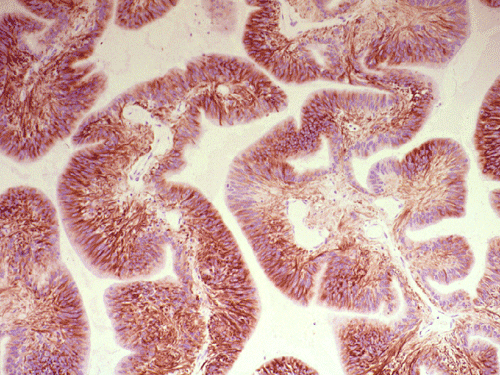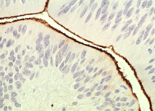 On immunohistochemistry, the luminal boder of the cells are strongly positive for epithelial membrane antigen (EMA) (Panel D). The tumor cells are also strongly positive for glial fibrillary acidic protien (GFAP) (Panel E).