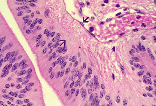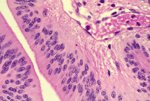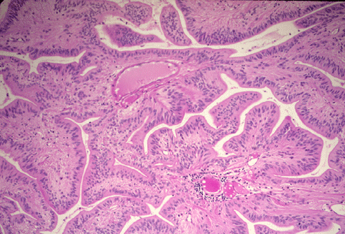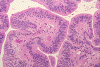 The histopathology of the tumor is fairly similar in different parts of the of the tumor and the papillary structures are the obvious (Panel A). On medium and high magnification (Panel B and C respectively), the cores of the papillary structure is composed of thin walled blood vessels. The tumor cells appear to appear in a pattern reminiscent of the pseudocolumnar arrangement of the respiratory respiratory epithelium except that no basement membrane can be identified. The cores are also not composed of collagenous tissue but by fibrillary process that appear to extends from the nuclei. A zone of hyponuclear area is present between the nuclei and the vascular channels (delimited by arrows in Panel C). No cilia are noted on the surface epithelium and no mucin production is noted. The cytoplasmic border is very indistinct. The nuclei appear to be rather bland appearing and mitotic figures are not readily seen. There is neither endothelial proliferation nor necrosis.