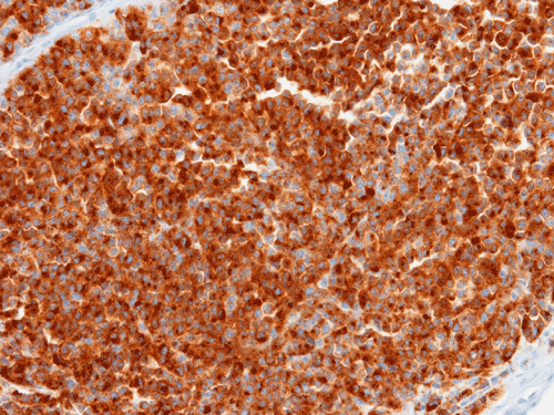 Immunohistochemically, SNMM are positive for S100 and markers for melanomas including HMB45, Mart-1, and tyrosinase. Most of them do not express significant amount of melanin. P16 is expressed in a significant number of these tumors and is mainly related to deletion of 9p21 region 6.
