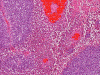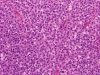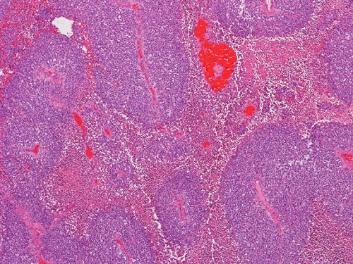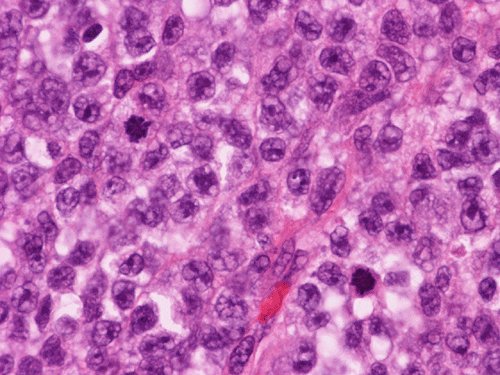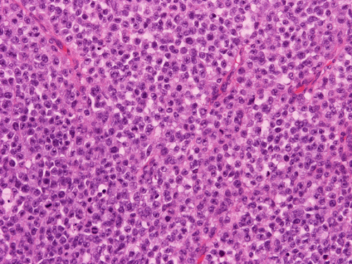Malignant lymphoma: Lymphoma presenting in the paranasal sinuses are frequently B-cell lymphomas, with diffuse large B-cell lymphoma (DLBCL) being the most common. The tumor cells are usually dyscohesive and monotonous. The cells usually have round, multicoated or irregularly folded nuclei and multiple small membrane-bound nucleoli or single central prominent nucleolus. DLBCL can be readily distinguished from other tumors by immunohistochemical stains, which show positive reactivity for leukocyte common antigen (LCA) and CD20.