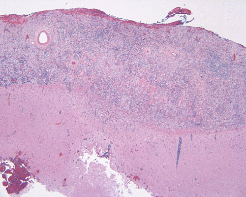 Clinical information: The patient was a 45 year-old man who complained of headache and two attach of seizures in the past four months. On MTI, there was a 3 cm enhancing, plaque-like mass in the parietal lobe. It was not certain whether the mass was extra-axial or intra-axial but meningioima was suspected. No other abnormal findings were noted on systemic work up. The mass appeared tightly adhered to the underlying brain parenchyma upon surgical resection. The following images were obtained from the excised specimen