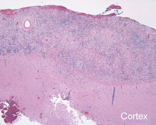 The specimen is in the form of a plaque-like, firm lesion adhered to a layer of brain parenchyma on one side (Panel A) The lesion infiltrate into the underlying brain parenchyma which leads to the formation of an irregular interphase. There is also perivascular accumulation of lymphocytes around blood vessels (Panel B and C). On low-mangification, the lesion appears to be a mixture of lymphocytes and large cells with foamy histiocytes. The salient feature of the lesion is that of a mixture of mature lymphocytes with large to giant histiocytes (Panel D). The histopathologic picture is rather homogeneous in different parts of the lesion. On high-magnification, the large to giant histiocytes has enlarged nuclei and many of them contain engulfed lymphocytes or polymorphonuclear leukocytes (emperipolesis ) (arrows in Panel E an F).