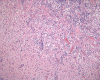 Histiologically, the features of cranial RDD are similar to those occurring in the lymphnodes. Lesions are composed of sheets or syncytia of large, pale histiocytic cells with abundant granular eosinophilic cytoplasm and ill-defined or feathery cytoplasmic borders in a lymphocytic, chronic inflammatory cell background. Extranodal sites commonly exhibit a degree fibrosis and this can obscure the visibility of the histiocytic proliferation. Nuclei of the large histiocytes vary in size and may be large, round and vesicular with smooth nuclear contours 2. A mild degree of cytological atypia is commonly seen. Most nuclei contain a single small nucleolus, but others possess multiple nucleoli or a single prominent nucleolus. Mitotic figures are usually difficult to detect or are absent altogether. The prominent background of chronic inflammation is largely comprised of a mature plasmacytic infiltrate with interspersed lymphoid follicles 2. Emperipolesis is consistently found in nodal disease and often is less evident at extranodal sites. Its recognition is key to correct diagnosis.