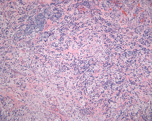 The etiology of RDD is unknown although a viral pathogenesis has been postulated. Numerous reports have identified human herpesvirus 6 (HHV-6) in visceral and cutaneous lesions 8. However, HHV-6 has frequently been found in many reactive and infectious disorders of lymphoid tissue, and its presence in Rosai-Dorfman disease is non-specific. Immunophenotypic profiling and studies of monokine expression suggest an origin from activated macrophages, which have been shown to produce IL-1-beta and and TNF-alpha. Molecular studies using polymorphic regions of the human androgen receptor locus have demonstrated that RDD is a polyclonal disorder 2.Extranodal involvement: