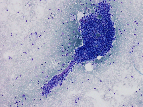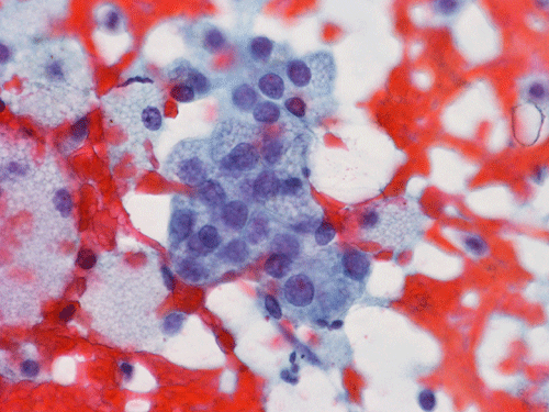 Clinical information: The patient was a 63 year-old man who has bilateral renal masses. A fine needle aspiration (FNA) was performed on the right kidney and the followings are representative images.