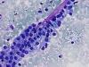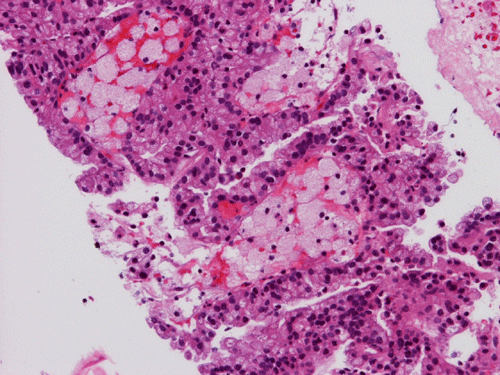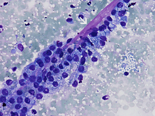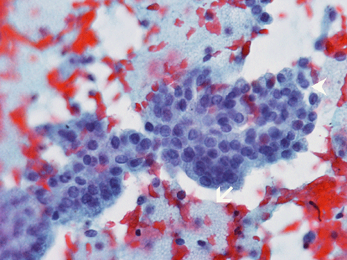 Histologically, the proportion of papillary growth can vary. While papillary growth can be the dominant pattern in some tumor, tumors composed of predominantly solid growth areas can be seen. The papillary growth has fine, delicate fibrovascular cores. Foamy macrophages are usually abundant and they are usually wonderful diagnostic suggestions. However, it should be noticed that areas that lack foamy macrophages can occur. This is particularly important when the specimen is small such as FNA specimens. The tumor cells fall into two major cytologic types. Type 1 tumors cells vary from small cells with inconspicuous pale cytoplasm and small, uniform, spherical nuclei with small or invisible nucleoli. Type 2 tumor cells are larger cells with abundant eosinophilic cytoplasm and large, spherical nuclei, prominent nucleoli and pseudostratified arrangement. Mixed pattern within the same tumor is not uncommon. 1, 2, 4, 5