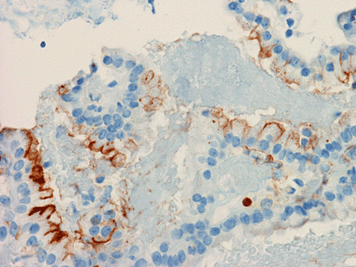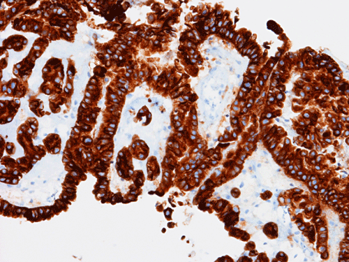 Due to its peculiar histology, there are several major differential diagnoses. First, the bilaterality and multicentric property in combination with its papillary structure invariably would suggest metastatic carcinoma. PRCCs do not have the deep nuclear groove of papillary thyroid carcinoma. The presence of macrophages is a good suggestion of PRCC but by no mean a fool proof feature. Immunohistochemistry can in the diagnosis.