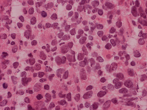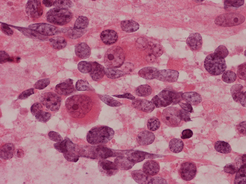 Histologically, our discussion will be limited to the conventional or classic type of medulloblastoma and large cell and anaplastic medulloblastoma. The conventional or classic type [Click here to see images of a classic medulloblastoma] is essentially a blue cell tumor with extremely high nuclear to cytoplasmic ratio. A solid sheet like growth without specific pattern formation is common. Homer Weight rosette can be seen but they are not frequent features. Fine threads of cytoplasm, also known as neuropils, are rather typical. On histologic sections, the nuclei are rather homogeneous in size. Morphologically, they resemble raisin or crumbling carrots. Mitotic figures are common. Cells with pyknotic nucleoli and apoptotic cells are usually present. necrosis may be seen and usually occur as small spotty areas. The histopathologic features on frozen sections are similar. Similar to other small blue cell tumors, however, preservation of nuclear details is usually suboptimal. Intraoperative cytologic preparations is the best remedy and would provide excellent cytologic and nuclear details. It should be noted that even though the nuclear appear homogeneous in size on fixed sections, a good range of variation in nuclear size with the smaller nuclei about one third the size of the largerest nuclei can be seen. The larger nuclei are often bilobed. The chromatin, regardless of the nuclear size, typically give a coarse, "dirty", hyperchromatic appearance. A large, prominent nuclei is not a classic features and when this particular feature is present, a diagnosis other than a classic medulloblastoma should be entertained. In well done cytologic preparation, a thin rim of cytoplasm can be seen in a small proportion of the nuclei. The majority of the nuclei, however, would exist as naked nuclei.
