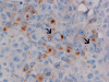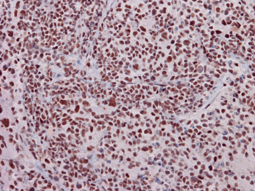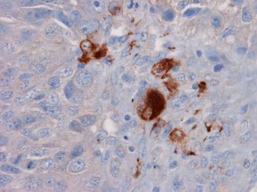 Immunohistochemistry, both classic, anaplastic, and large cell variants are similar. Immunoreactivity for synaptophysin can be demonstrated in most of the tumors. A small tumor that is negative for synaptophysin should raise a serious questions about the diagnosis of medulloblastoma. Expression of other markers such as neurofilament proteins, markers of photoreceptors, and glial fibrillary acidic protein (GFAP) can be seen. In contrast to glial tumors, mutation of p53 is quite uncommon. Isochromosome 17 is the most consistent genetic changes but it should not be used as a diagnostic tool. C-MYC gene amplification is also a common genetic alteration and has been shown to be related to anaplasia . Although studies have linked c-myc and N-myc gene overexpression with anaplasia and a poorer prognosis, this still appears somewhat controversial 5, 6, 7. Based on a study with gene expression profile 8, medulloblastoma with better prognosis are associated with expression of genes that influence cerebellar differentiation (incluing the TRKC and sodium channel gene) and extracellular matrix genes (including elastin and collagen type V gene). Expression of cell proliferation and gene metabolism (including MYBL2 and LDH) are associated with bad prognosis. Epithelial membrane antigen (EMA) is usually negative in medulloblastoma. The possibility of an atypical teratoid rhabdoid tumor (ATRT) should be considered when a medulloblastoma-like tumor with positive immunoreactivity for EMA must be considered. Expression of cytokeratin can be present in a spotty manner. Extensive expression of cytokeratin should raise the possibility of a metastatic carcinoma.